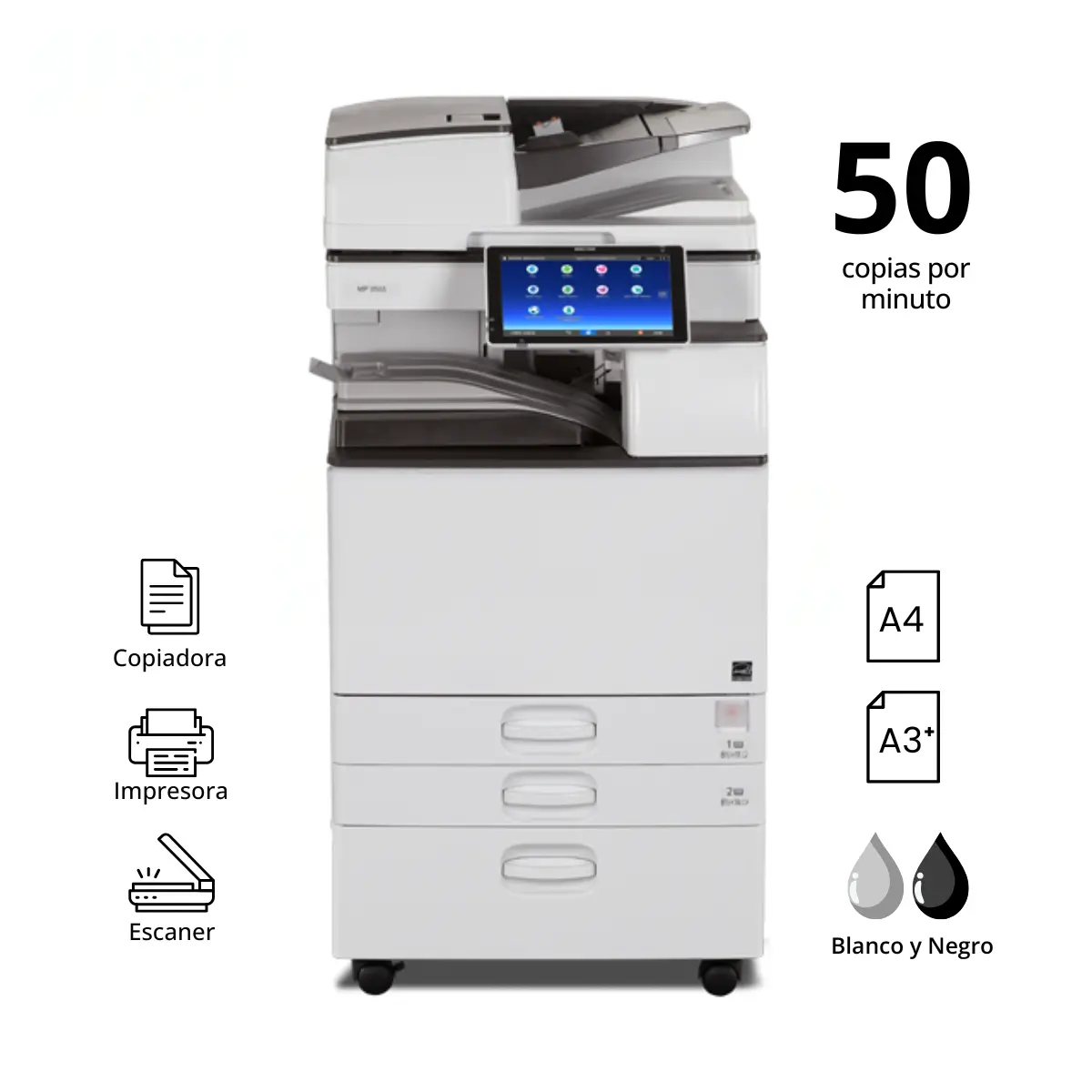 La Ricoh MP 5055 es una multifuncional A3 monocromática de alto rendimiento, que imprime hasta 50 páginas por minuto, ideal para entornos con gran exigencia de trabajo. Incorpora panel táctil de 10,1” tipo smartphone, escaneo dúplex a alta velocidad (~180 ipm), impresión dúplex automática y funciones completas de copiado, escaneo, impresión y fax opcional. Ofrece conectividad móvil, impresión desde USB, seguridad avanzada con autenticación de usuario y cifrado de disco. Perfecta para oficinas medianas y grandes que buscan velocidad, confiabilidad y control de costos operativos.